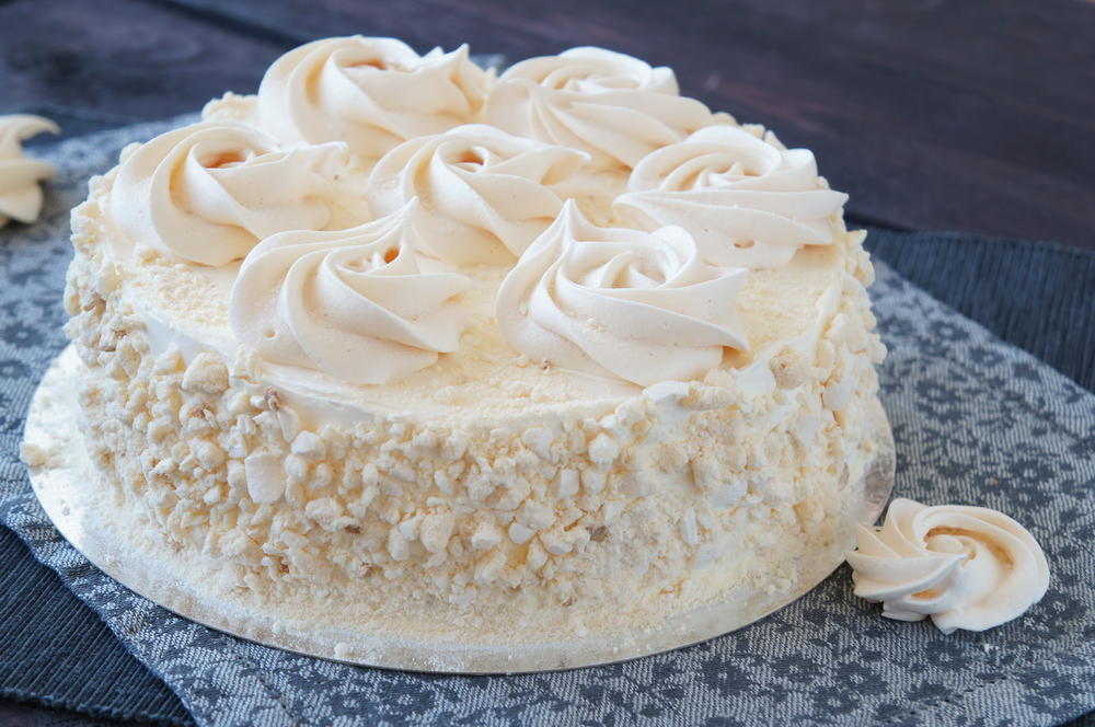 Priprema: Sve sastojke za koru izmešati kašikom i smesu izliti u podmazan i brašnom posut pleh, pa peći koru na 200 stepeni 20 min. Na isti način napraviti još jednu koru. Kad se kore ohlade preseći ih na pola da se dobiju ukupno 4 kore.