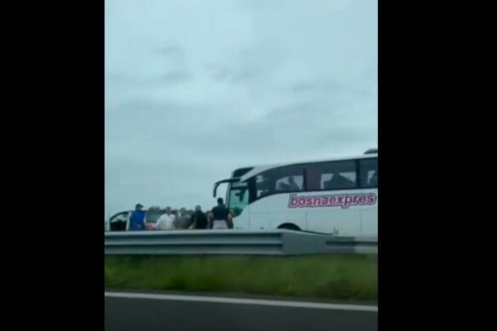 U četvrtak poslepodne na autoputu A3 kod Rugvice došlo je do opšte tuče. Na snimku se vidi grupa ljudi koja se mlati.