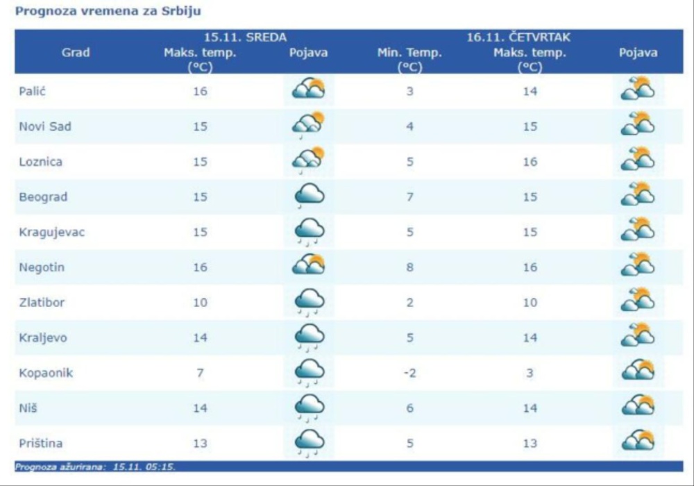 Kako dodaju, na severu Vojvodine razvedriće se već pre podne, a u ostalim krajevima prestanak padavina i razvedravanje uslediće posle podne i uveče.