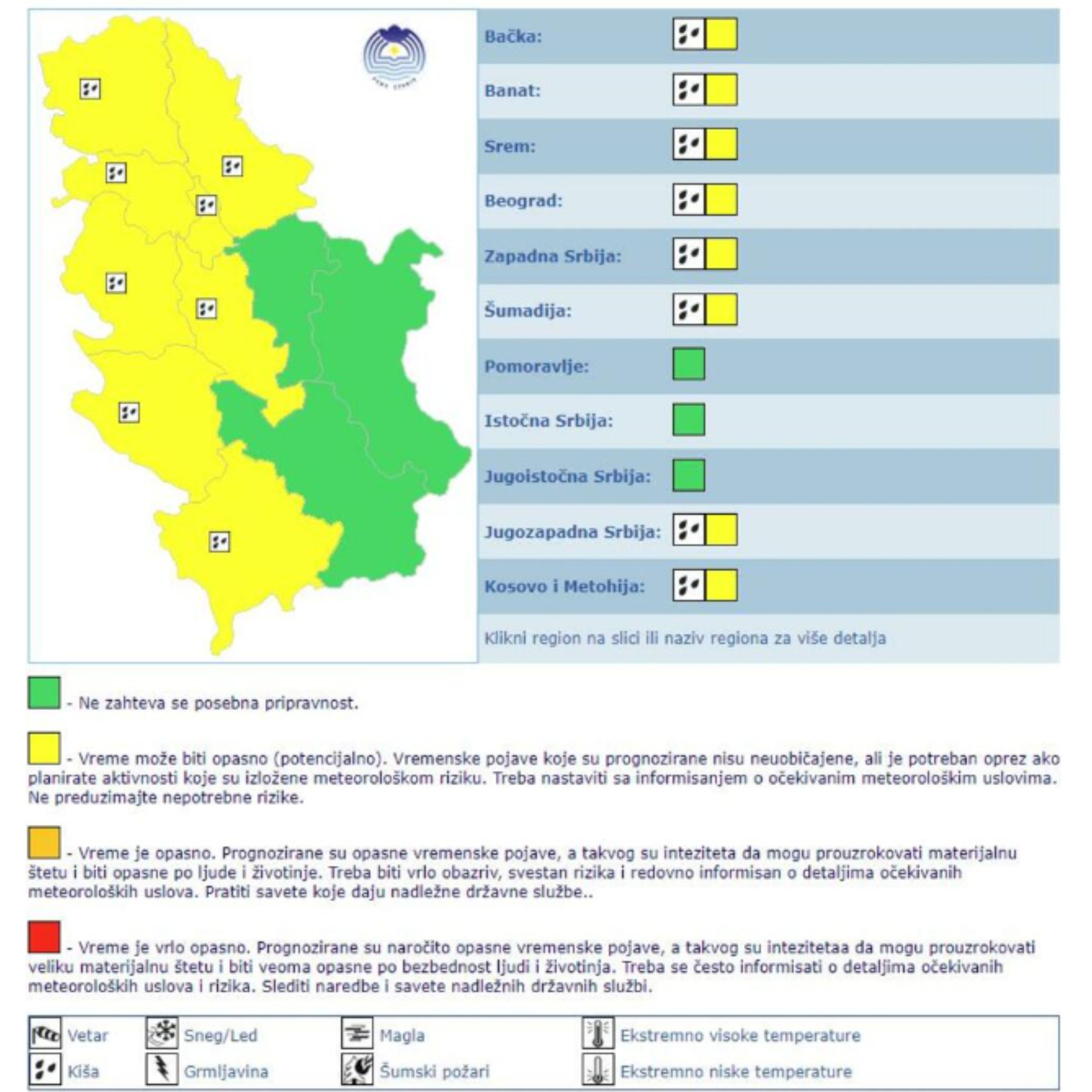 Žuti meteo alarm znači da je vreme potencijalno opasno: vremenske pojave koje su prognozirane nisu neuobičajene, ali je potreban oprez ako planirate aktivnosti koje su izložene meteorološkom riziku.