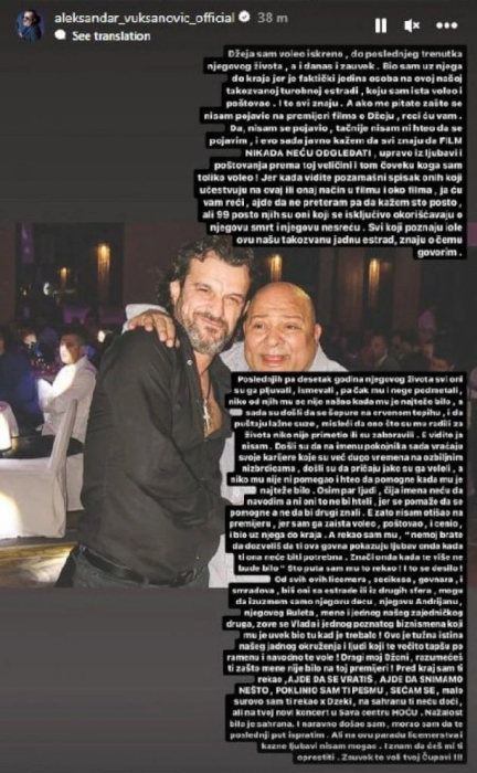 – Poslednjih desetak godina njegovog života svi oni su ga pljuvali, ismevali, pa čak mu i noge pdometali, niko od njih mu se nije našao kada mu je najteže bilo, a sada su došli da se šepure na crvenom tepihu i da puštaju lažne suze, misleći da ono što su mu radili za života niko nije primetio ili su zaboravili. E vidite, ja nisam! Došli su da na imenu pokojnika sada vraćaju svoje karijere, koje su već dugo vremena na ozbiljnim nizbrdicama, došli su da pričaju jako su ga voleli, a niko mu nije pomogao i hteo da pomogne kada mu je bilo najteže. Osim par ljudi, čija imena neću ni da navodim, a ni oni to ne bi hteli, jer se pomaže da se pomogne, a ne da bi drugi znali. E, zato nisam došao na premijeru, jer sam ga zaista voleo, poštovao i cenio, bio uz njega do kraja. A rekao sam mu: ,,Nemoj brate da dozvoliš da ti ova g*vna pokazuju ljubav onda kada ti ona neće biti potrebna. Znači, ona kada te više ne bude bilo”. Od svih licemera, secikesa i smardova, bili oni sa estrade ili iz drugih sfera, mogu da izuzmem samo njegovu decu, njegovu Andrijanu, njegovog Ruleta, mene i jednog našeg zajedničkog druga, zove se Vlada i jednog poznatog biznismena koji mu je uvek bio tu kada je trebalo. Ovo je tužna istina našeg jadnog okruženja i ljudi koji te večito tapšu po ramenu i navodno te vole. Drago moj Džoni, razumećeš ti zašto mene nije bilo na toj premijeri! Pred kraj sam ti rekao da se vratiš, da snimamo nešto, poklonio sam ti pesmu, sećam se, malo surovo sam ti rekao Džeki, na sahranu ti neću doći, ali na tvoj novi koncert hoću. Nažalost, bila je sahrana. I naravno, došao sam, morao sam da te poslednji put ispratim. Ali na ovu paradu licemerstva i lažne ljubavi nisam mogao. I znam da ćeš mi ti oprostiti. Zauvek te voli tvoj Čupavi.