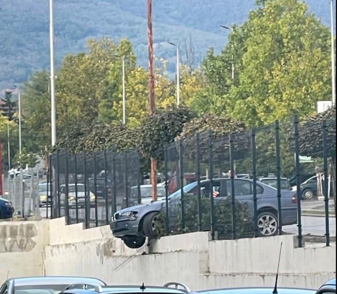 Naočigled prolaznika, automobil marke “BMW” išao je iz pravca kasarne kada je i izleteo i popeo se na ogradni zid tržnog centra koji se nalazi na ulazu u grad Vranje.