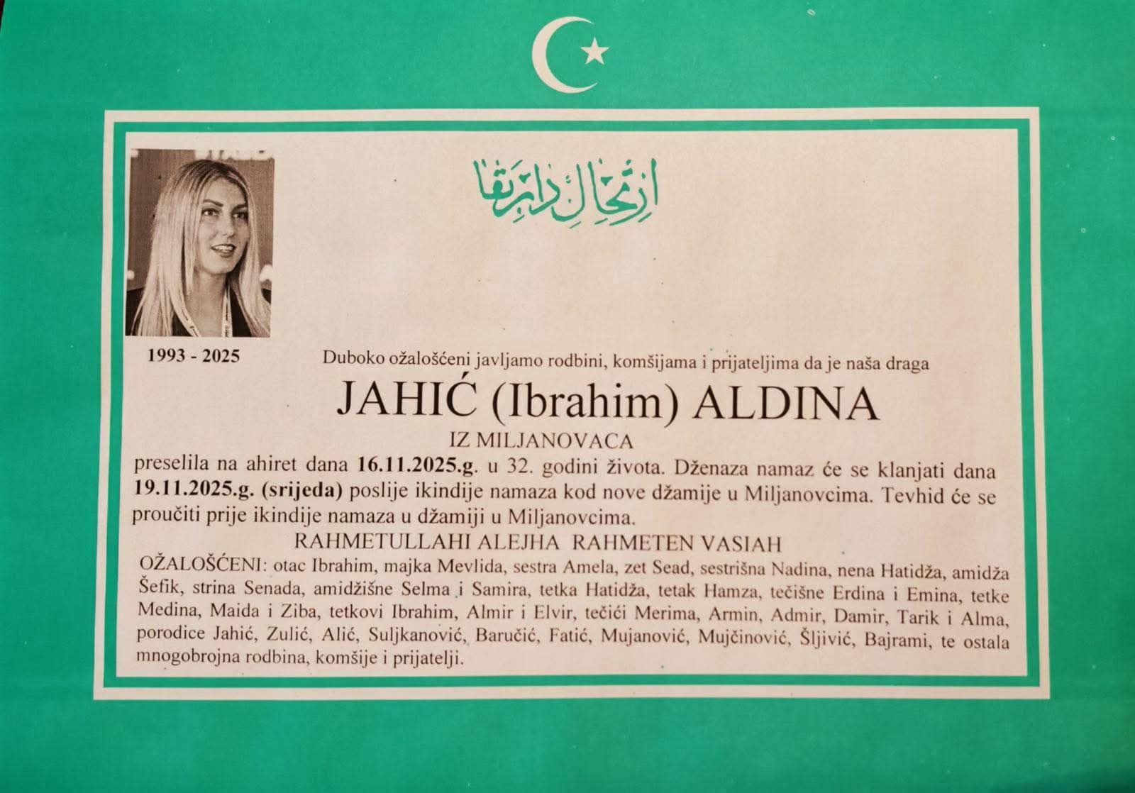 Dženaza-namaz Aldini Jahić bit će klanjana u srijedu, 19. novembra, nakon ikindije namaza, kod nove džamije u Miljanovcima.