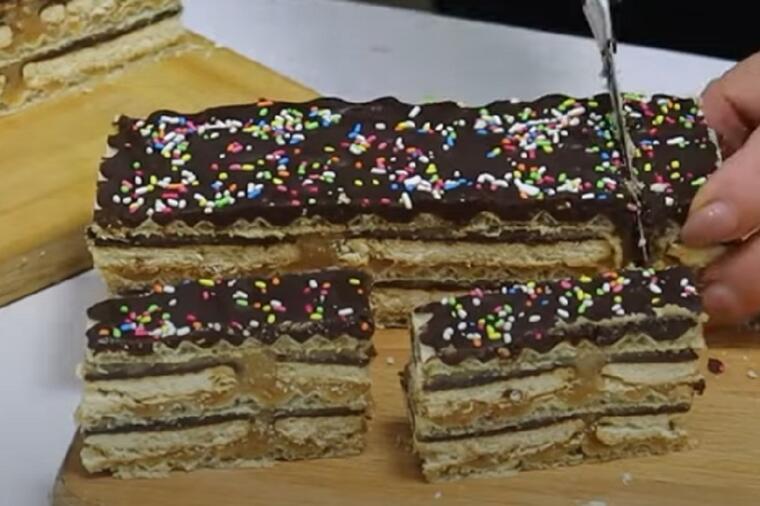 Priprema: Mleko, šećer, puter i čokoladu stavite na ringlu da se istopi. Dodajte keks i sjedinite sve. Ostavite fil da se prohladi. Toplim filom filujte oblandu. Potrebno je 3 lista oblande i čokoladni keks. Filujete koru oblande, a potom stavljate čokoladni keks koji ste natopili u mleku. Kada završite sa postavljanjem keksa, stavite fil i tako dok ne potrošite materijal. Sve pritisnite sa nečim teškim da se malo slegne. Prelijte sa crnom čokoladom i slatkom pavlakom, pa ukrasite šarenim mrvicama ili orasima.